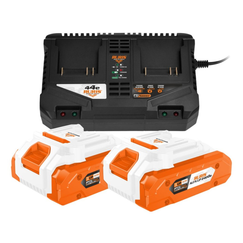 Sada 2 batérie + dvojitá nabíjačka RURIS Alfa UP 4444e má napätie 20V a kapacitu 4Ah.